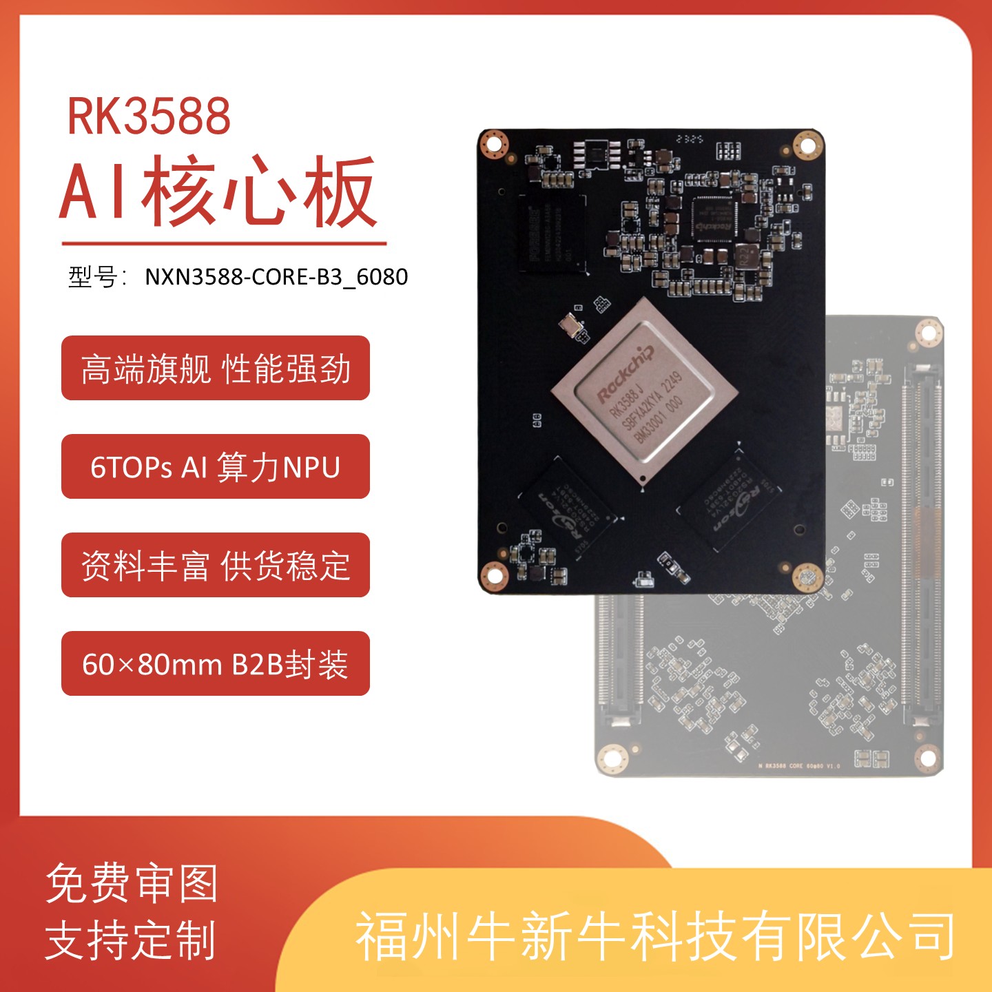 NXN3588-CORE-B3_6080核心板模块是福州牛新牛科技有限公司推出的一款高性能AIoT核心板。它基于瑞芯微旗舰级RK3588芯片,采用8核64位ARM架构(4x Cortex-A76 @ 2.4GHz + 4x Cortex-A55 @ 1.8GHz),并集成6 TOPS NPU,为各类边缘计算和人工智能应用提供强大的算力支撑。其小巧的尺寸设计,便于嵌入到各种空间受限的智能设备中。