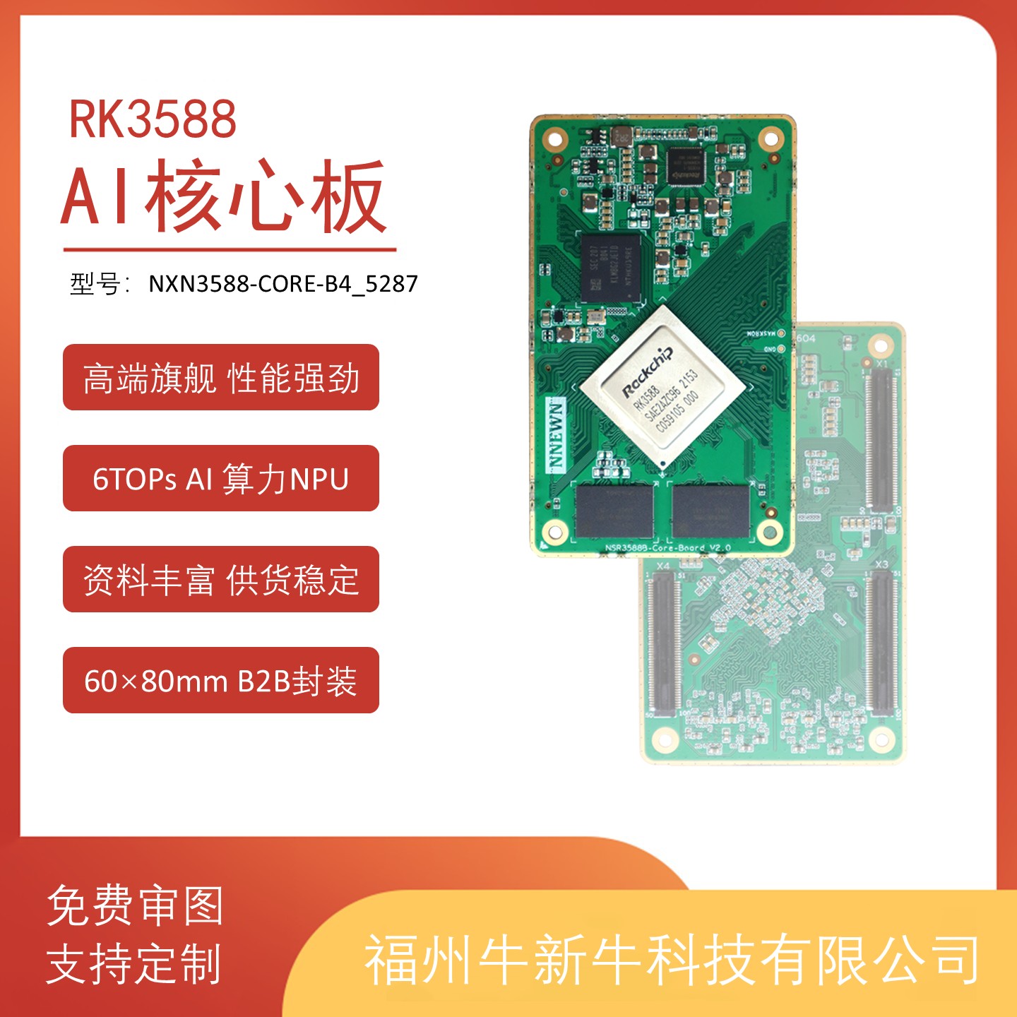 NXN3588-CORE-B4_5287核心板模块是福州牛新牛科技有限公司推出的一款高性能AIoT核心板。它基于瑞芯微旗舰级RK3588芯片,采用8核64位ARM架构(4x Cortex-A76 @ 2.4GHz + 4x Cortex-A55 @ 1.8GHz),并集成6 TOPS NPU,为各类边缘计算和人工智能应用提供强大的算力支撑。其小巧的尺寸设计,便于嵌入到各种空间受限的智能设备中。